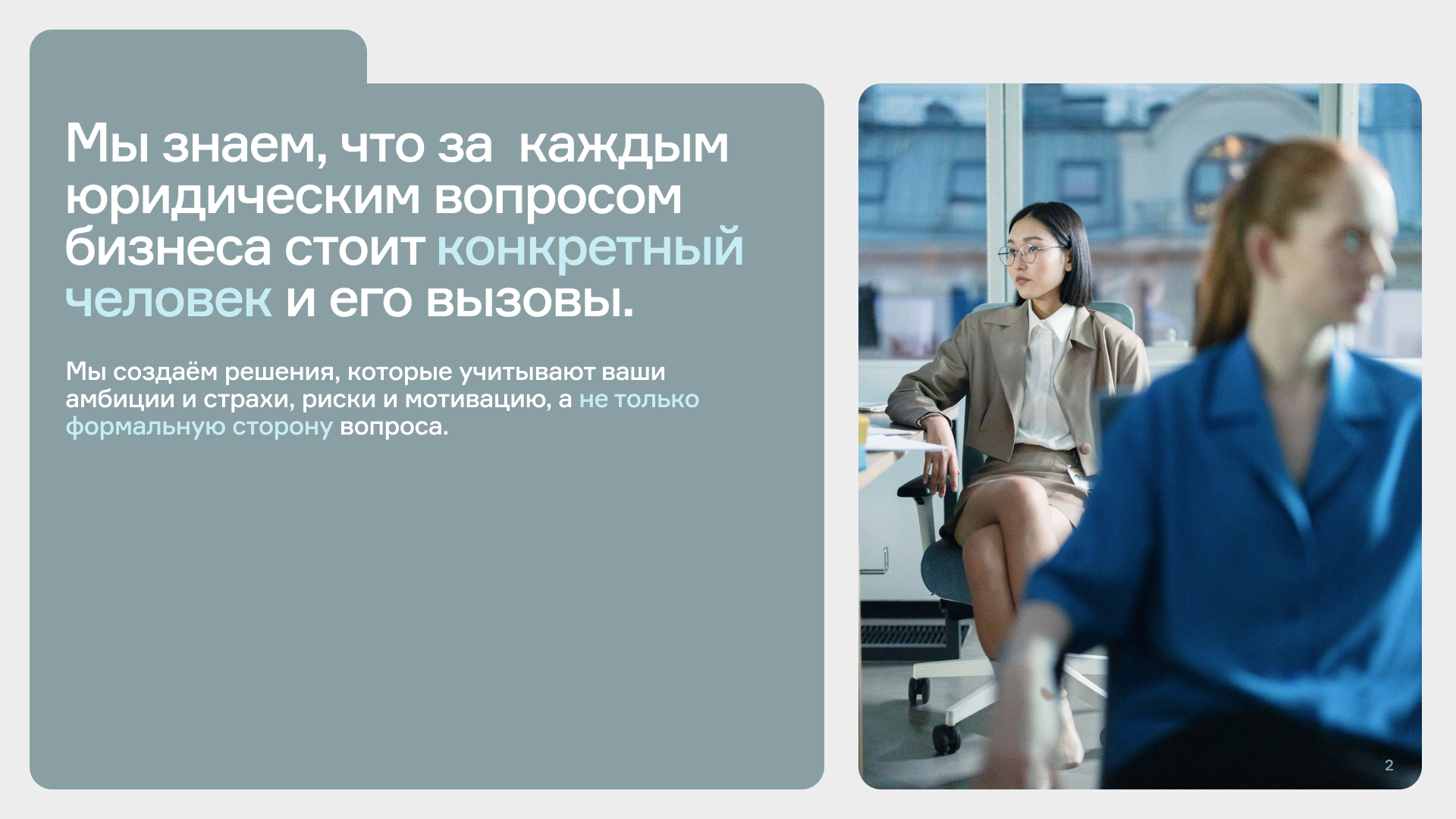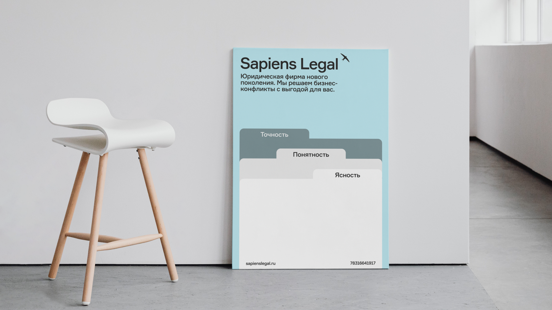 Минималистичный дизайн, ничего лишнего. Передаем точность и понятность графикой, в которой есть понятный принцип. Человечный подход — в пастельных цветах и шрифте без засечек, который обычно не используют юридические фирмы, и знакомых графичных образах стрижей.